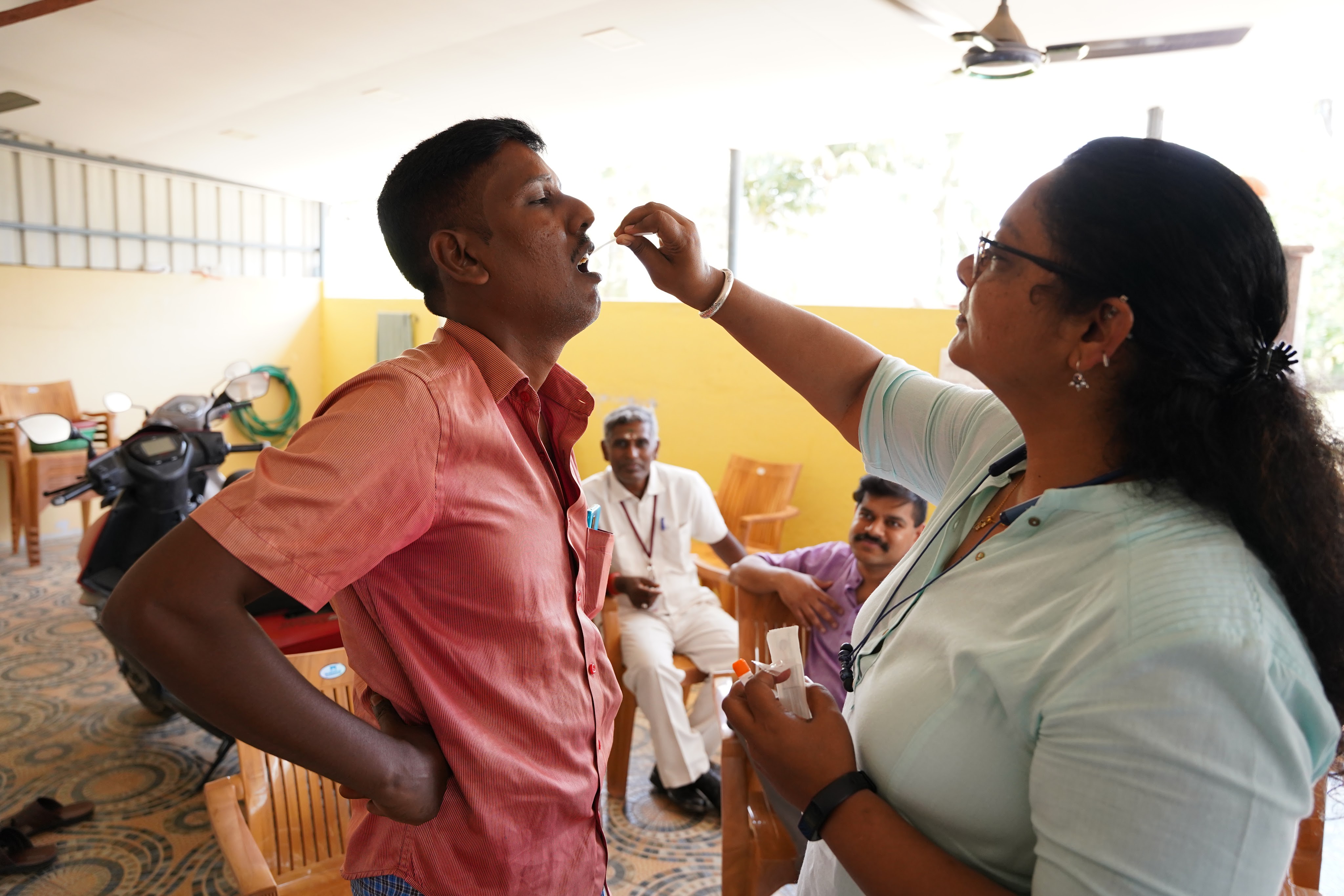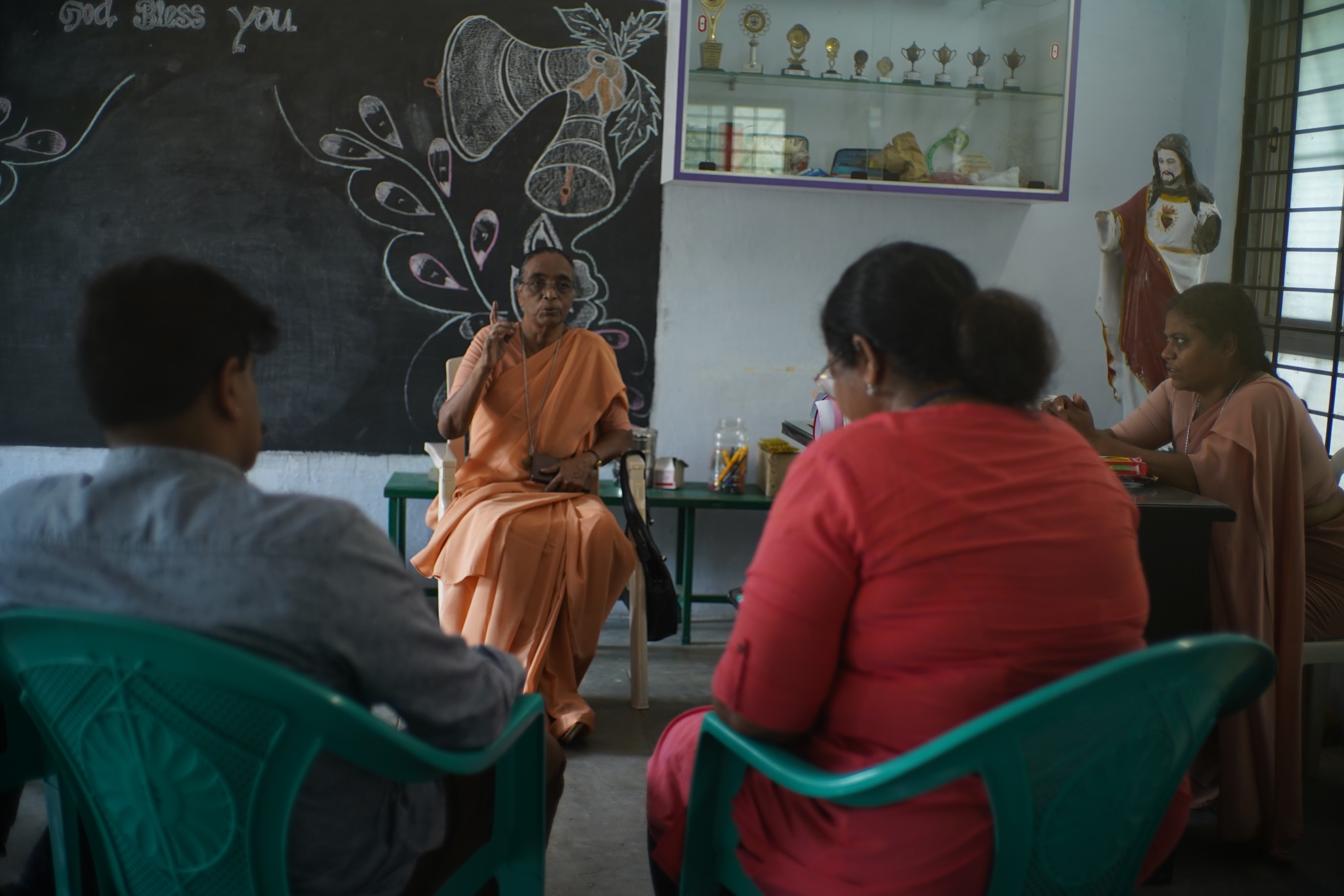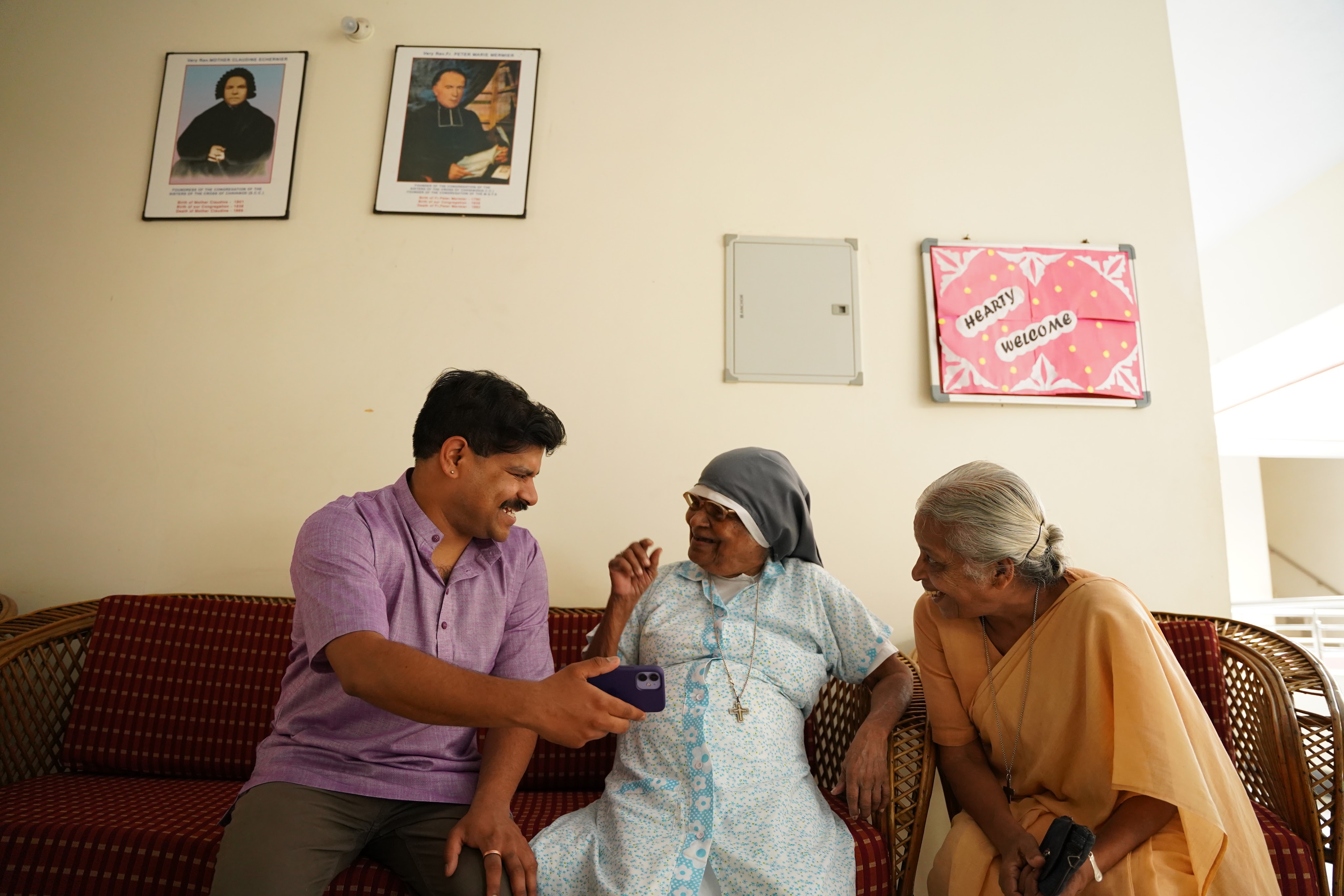 Kumar holding a newspaper with the second news story covering his search. The story ran in The Hindu News.Kumar and Surya (interpreter and photographer) in the hotel lobby.Anjali performing our first DNA swab of a man who we initially thought could be a brother but his age all but rules him out.Kumar thanking a community leader for making calls on our behalf and helping us with new leads.A doctor, village elder and parish leader wishing us luck and blessing us as we leave after a lengthy consultation.Snack break at a tea stall since we never seem to be able to fit lunch into our days.Anjali, two former orphanage staff members and Kumar walking in a central area of St. Joseph’s COllege where they now work.Kumar showing pictures to a former caretaker who looked after Kumar while he was at the orphanage.Former orphanage director, former orphanage caretaker and Kumar.Kumar showing a picture of himself and an elderly Sister who took care of Kumar in the orphanage (she is now about 90) while the former orphanage director looks on.
