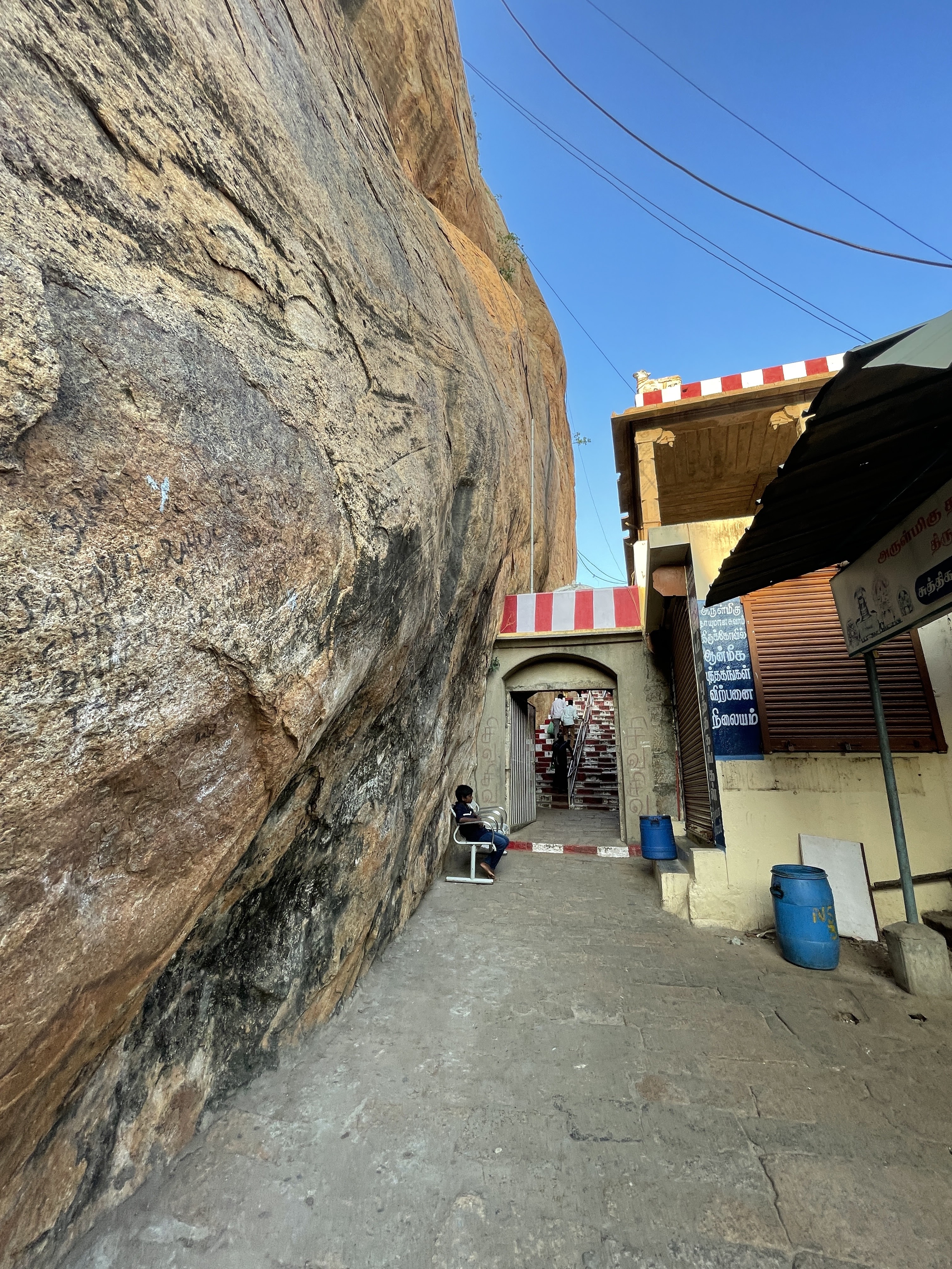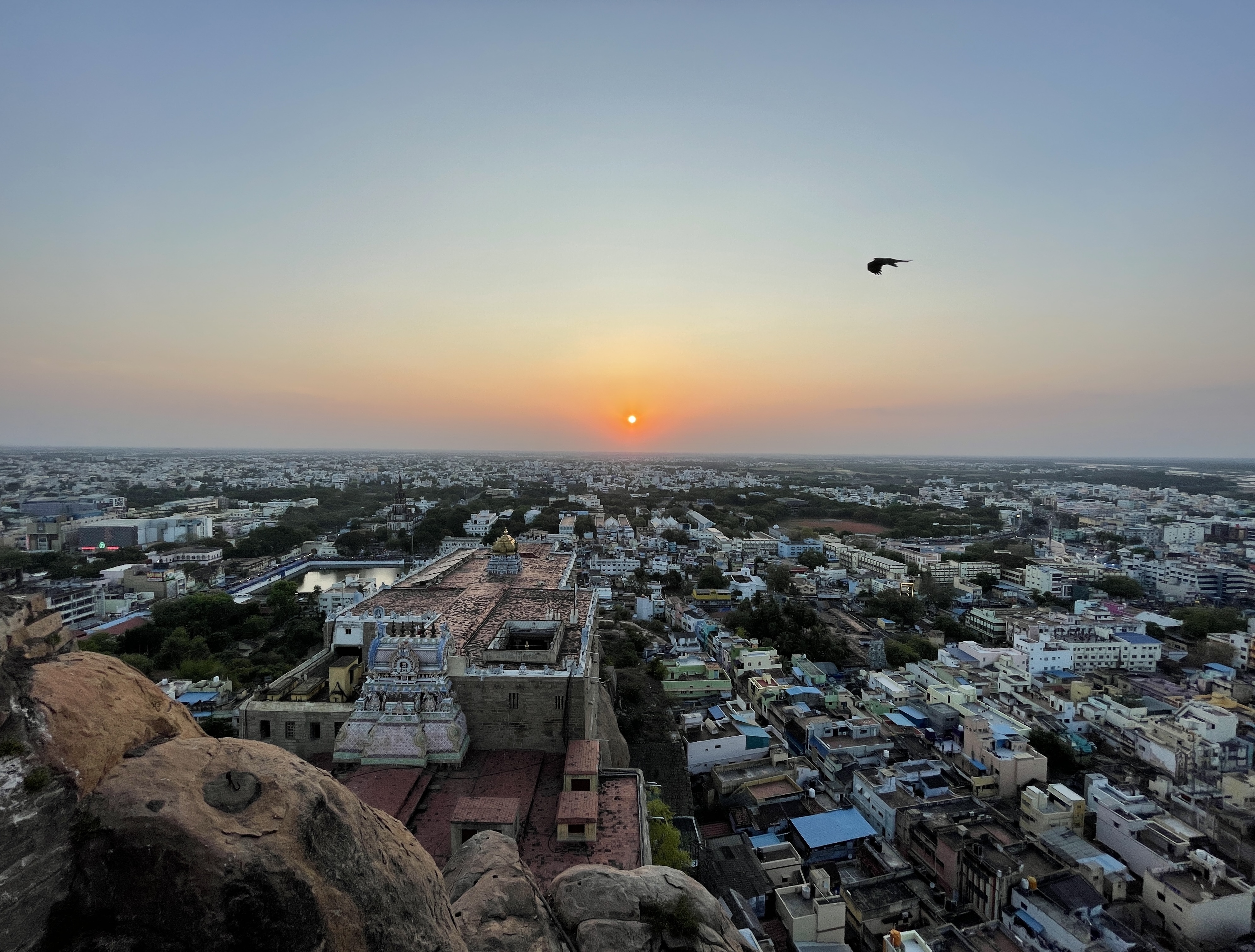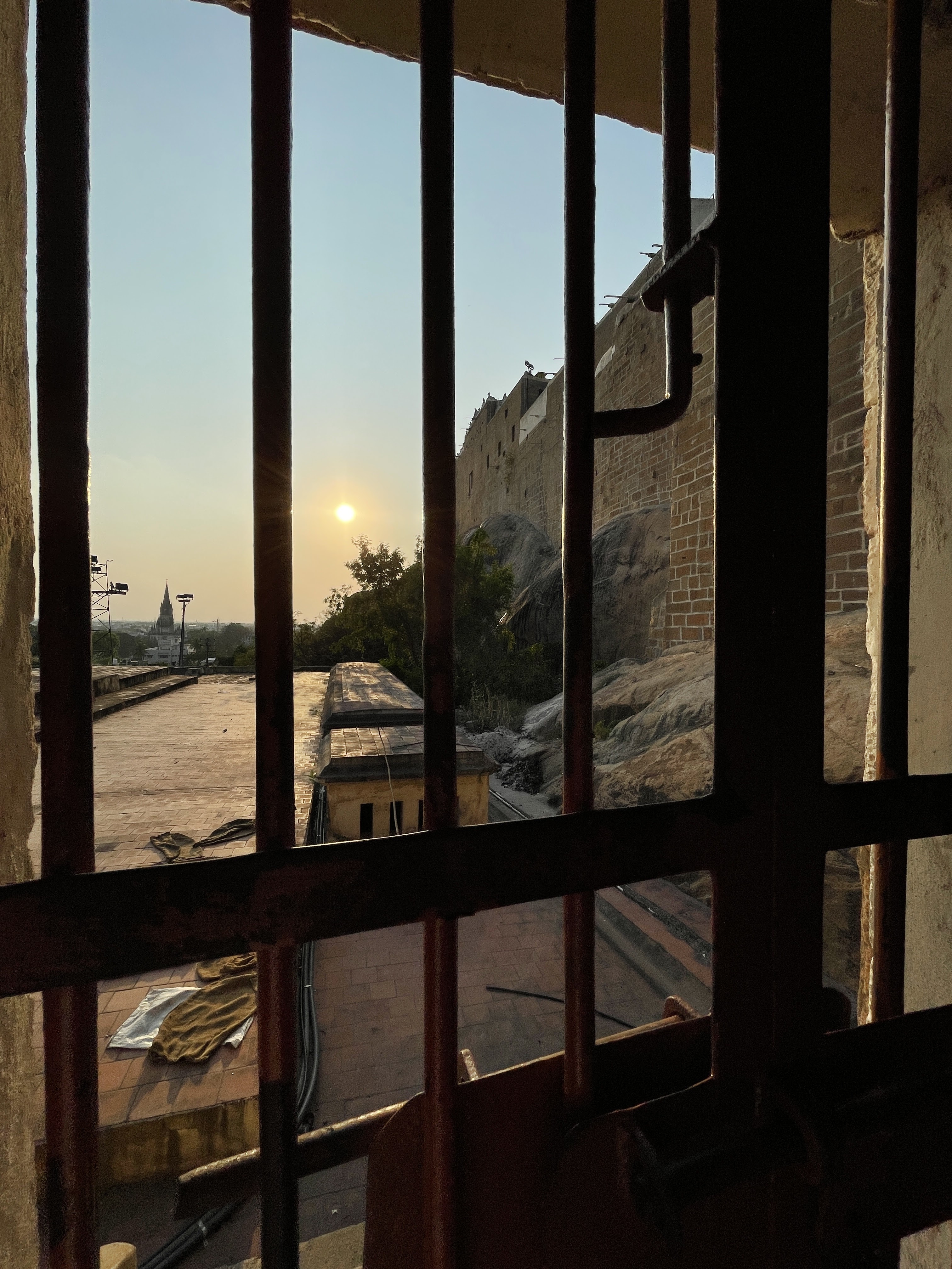 View from the interior stairwell of the Tiruchirappalli Rock Fort.View from three quarters of the way up the Tiruchirappalli Rock Fort.Sunset from the top of the Tiruchirappalli Rock Fort. Not sure what bird that is but it’s a large bird of prey.Bridge construction in a dry river channel in Thanjavur.View of the Brihadeeswarar Temple from the highway.Brihadeeswarar Temple temple main momunent.Diorama of the rice farming process. Southern India is India’s rice capital.Public park shelter where I sat and wrote for a few hours.Rice paddies from the view of the Chozan Express train from Thanjavur to Chennai. Chennai Egmore train station interior.